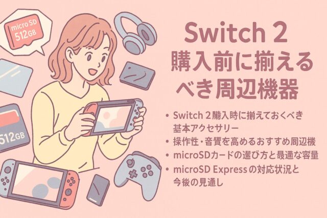 Nintendo Switch2の招待販売が始まり、いよいよ新世代のゲームライフが幕を開けようとしています。しかし、本体を手に入れるだけでは十分ではありません。快適に、そして長く楽しむためには、どんな周辺機器を揃えるかが大きなポイントになります。特に、microSDカードや保護フィルムといった基本アクセサリーから、音質や操作性を高める機器まで、事前に知っておくことで後悔のない買い物ができます。この記事では、Switch2を購入する前に知っておきたいおすすめ周辺機器と、話題のmicroSD Expressの必要性についてわかりやすく解説します。
