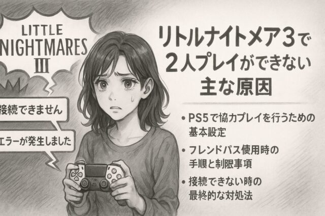 リトルナイトメア3を楽しみにしていたのに、いざ2人プレイを始めようとしたら「接続できません」「エラーが発生しました」と表示されてしまう――。そんな経験をされた方は少なくありません。特にPS5同士でプレイしている場合でも、通信設定やフレンドパスの認識不具合など、いくつかの要因が重なることで協力プレイがうまくいかないことがあります。