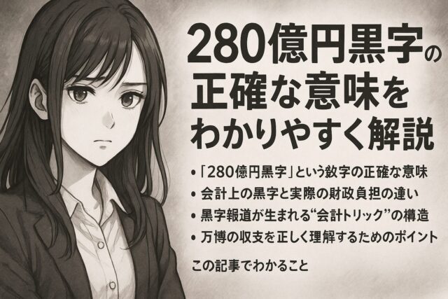 もし報道で「大阪万博は280億円黒字」と伝えられていたら、「それは運営会計の話か?」「インフラ費や関連支出は含まれているのか?」といった視点で見直す必要があります。