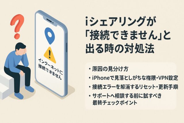 「iシェアリングで“インターネットに接続できません”と表示されて使えない…」そんな経験をした方は多いのではないでしょうか。特に、Androidでは問題ないのにiPhoneだけ接続できないという状況は混乱しやすいものです。実はこのトラブル、多くの場合はiPhoneの通信設定や権限・VPNなどの干渉によって発生しています。この記事では、iシェアリングの接続不良を解消するために確認すべきポイントを、初心者の方にもわかりやすく手順付きで解説します。焦らず順番に試していけば、ほとんどのケースで再び正常に位置共有ができるようになります。