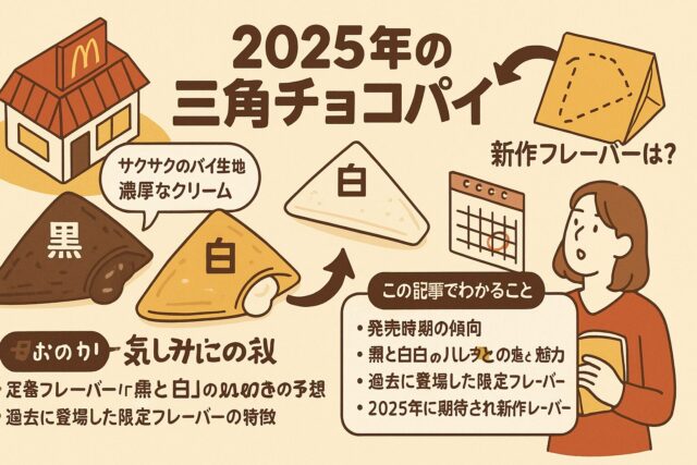 毎年、秋から冬にかけてマクドナルドに登場する「三角チョコパイ」は、季節を感じさせる大人気のスイーツです。サクサクとしたパイ生地にとろけるチョコクリームが詰まったこの商品は、定番の黒や白に加えて限定フレーバーも展開されるため、発売を心待ちにしている人が多いのが特徴です。2025年も例外ではなく、多くのファンが「いつから出るのか」「どんな味が登場するのか」と期待を寄せています。過去の販売データを振り返ると、発売時期には一定の傾向が見られる一方で、年によって多少のズレがあることも確認できます。今年はその傾向を踏まえながら、発売時期の予測と、ファンにとって気になる新フレーバーの可能性について整理していきましょう。