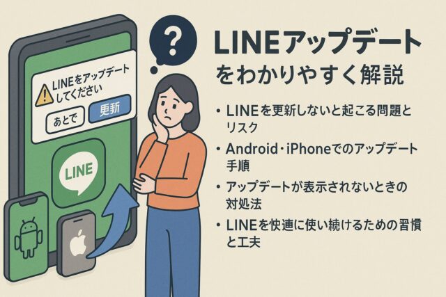 「LINEをアップデートしてください」という通知を見て不安になった経験はありませんか?特に「アップデートしないと使えなくなる」という話を耳にすると、すぐに対応しなければと焦ってしまう方も多いはずです。実際にLINEは定期的にアップデートが行われており、更新しないと使えなくなるケースも存在します。しかし、正しい手順を理解しておけば安心です。本記事では、LINEを最新版にアップデートする理由やメリット、そしてAndroid・iPhoneそれぞれでの具体的な操作方法を分かりやすく解説します。さらに、アップデートができない場合の対処法や、快適に使い続けるためのポイントも紹介しているので、これを読めば誰でも安心してLINEを利用し続けられるでしょう。